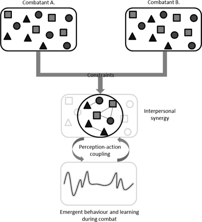 For our sport, instead of progressively loading weight, we load scenarios with gradual complexity, in order to continually challenge a learner’s perceptual systems. Check out this image from the afore-referenced article, which lays out the inter-relations of two combatants–or grapplers, if you will–and the ways in which behaviors and learning emerge.