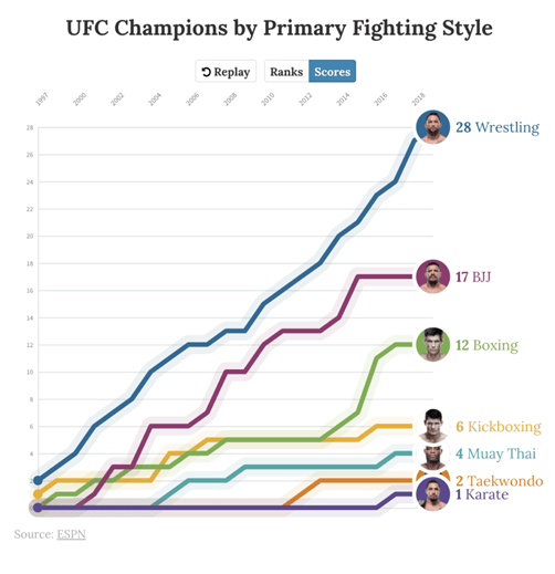 By emphasizing folkstyle wrestling and combining with other grappling modalities, our curriculum emphasizes takedowns, pins, and ‘no holds barred’ submissions that can be transferred to any combat ruleset and self-defense situation. This style of wrestling has become the most formidable weapon in mixed martial arts (see graphic below), and is the best tool for self-defense applications.